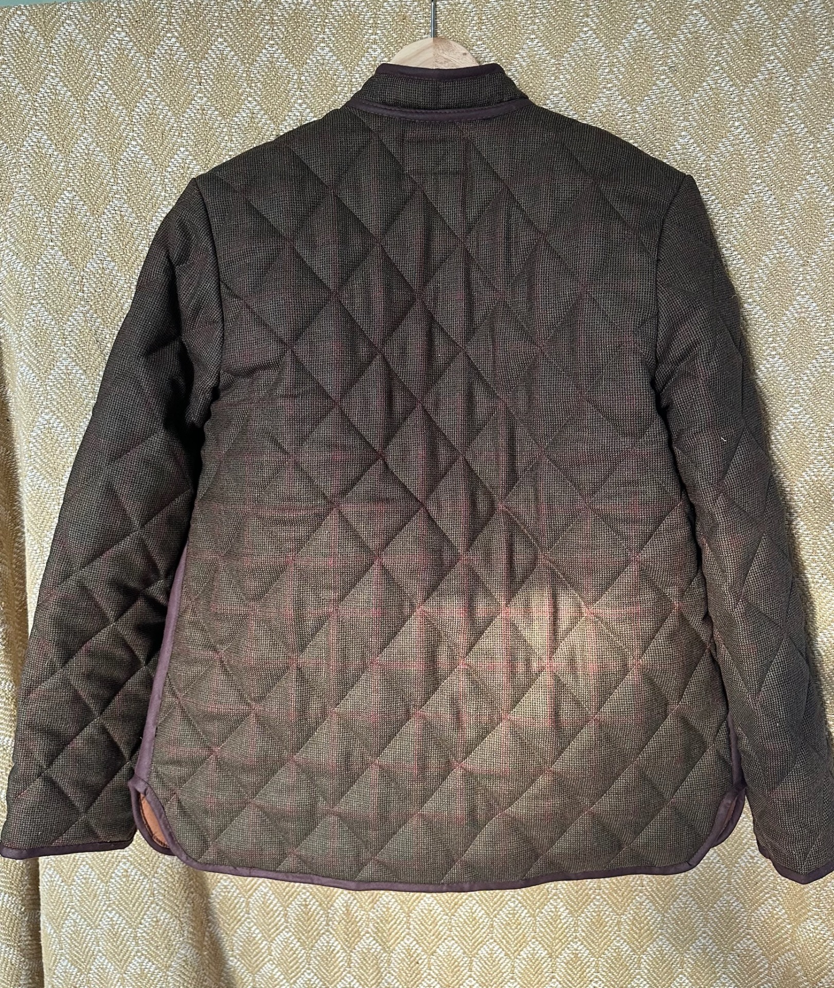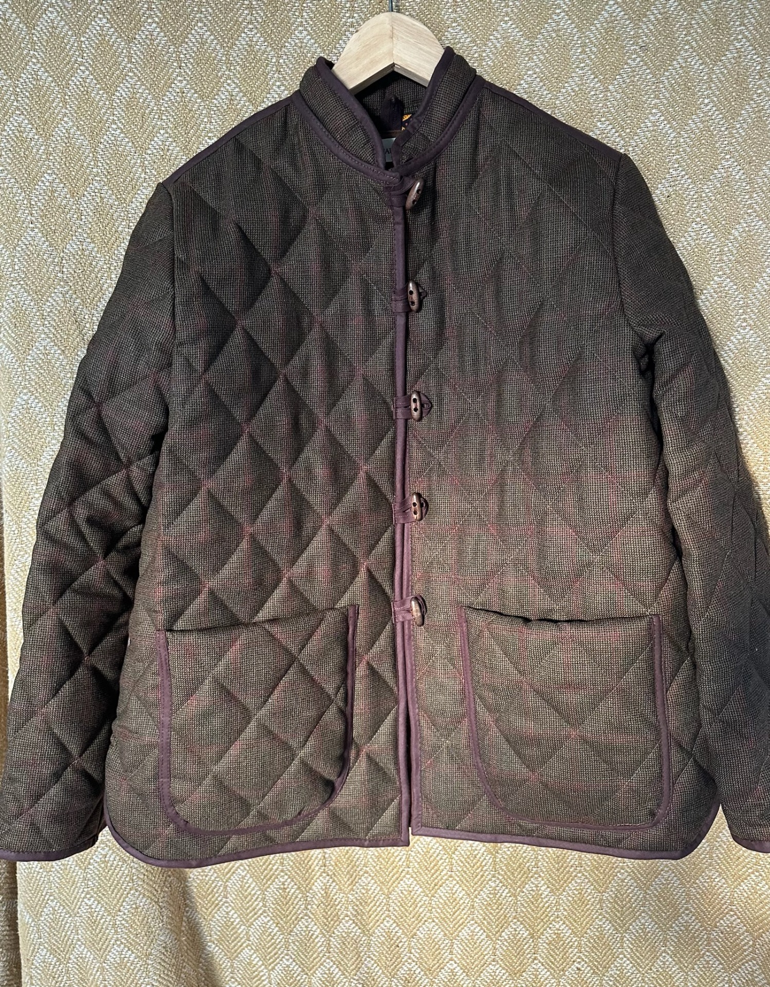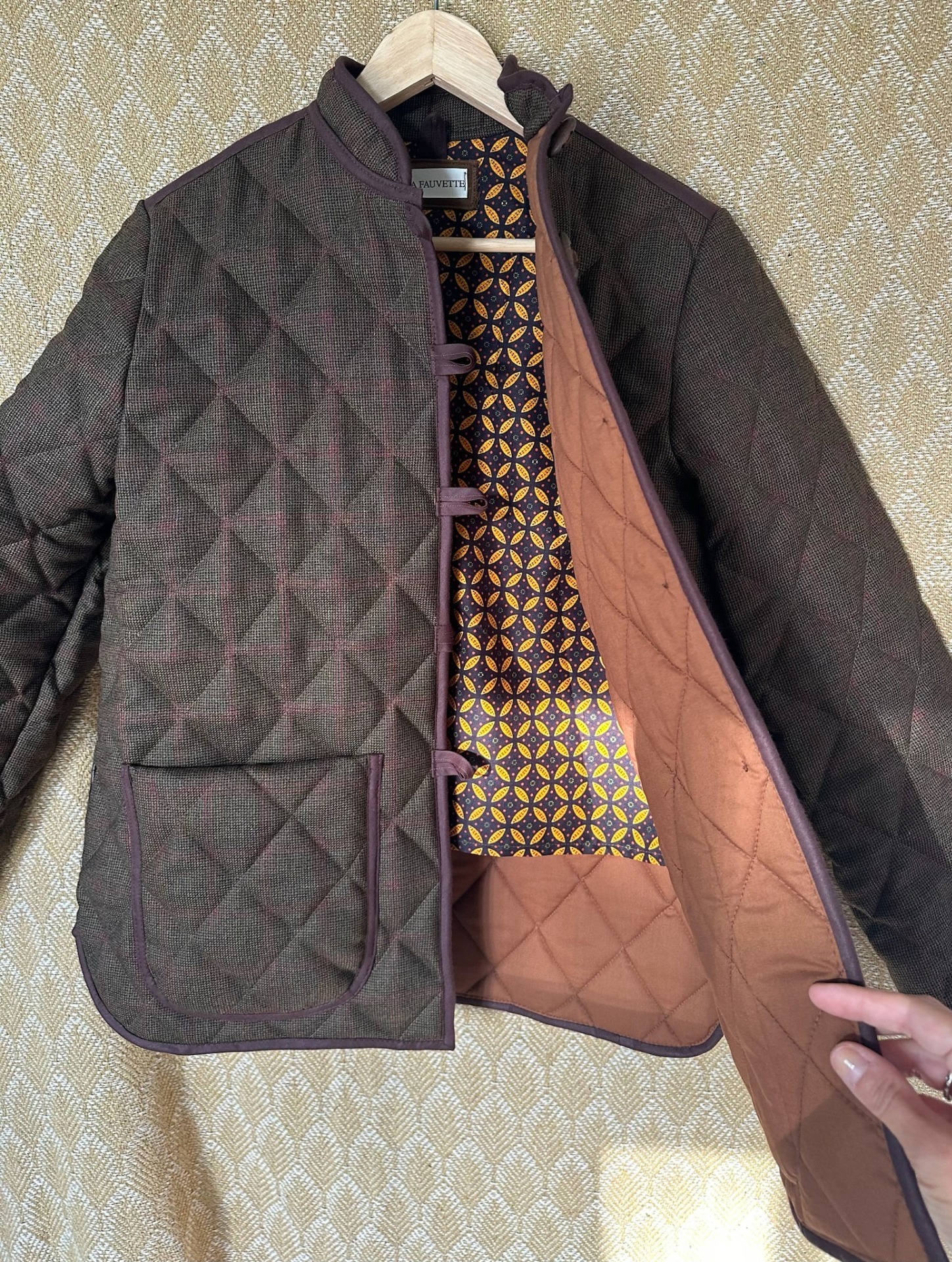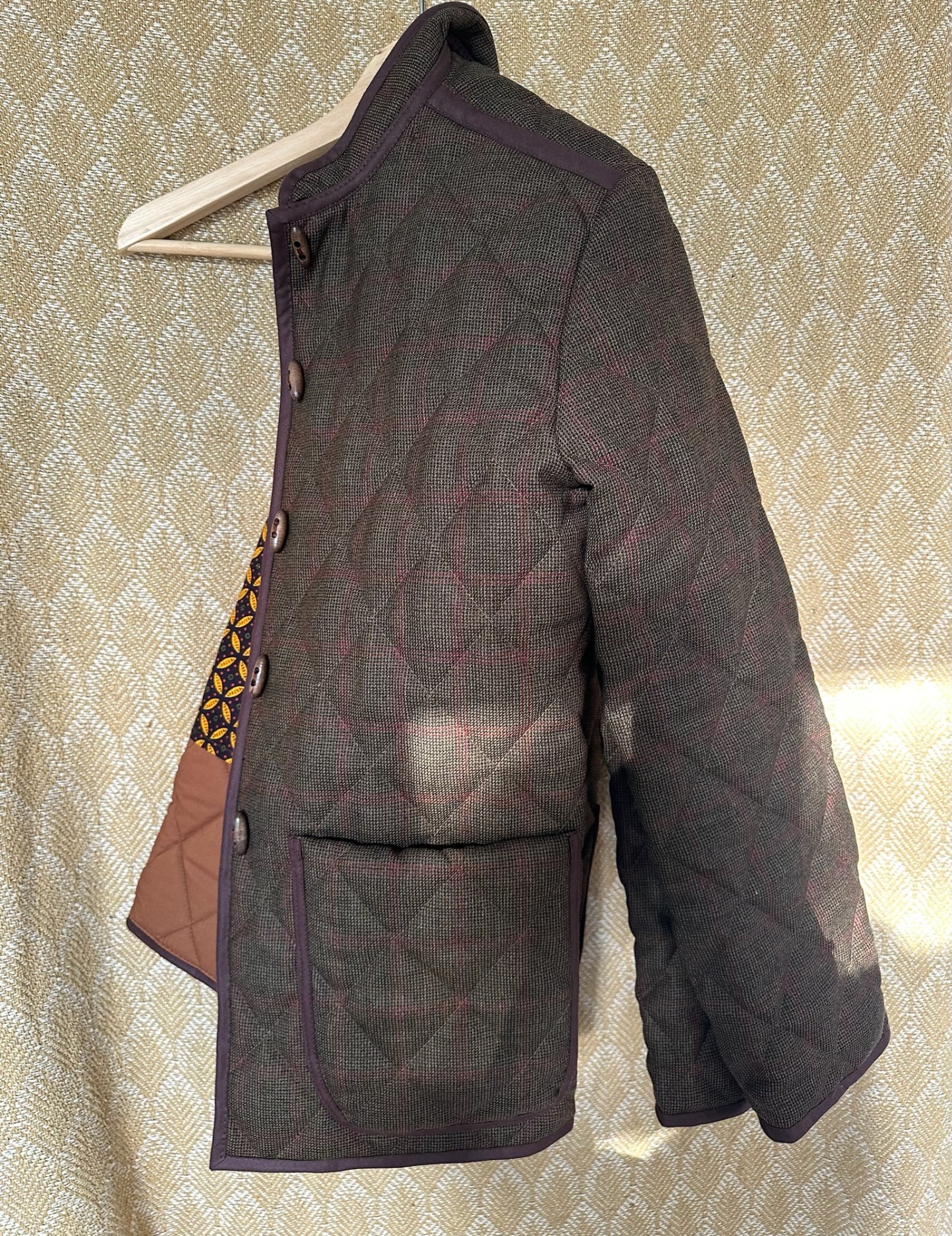 Robin quiltet jakke - lavet i vintage engelsk uld på ydersiden og bomuldspoplin i karamelfarve indeni. På ryggen indvendigt er sat et stykke afrikansk bomuld, som jeg har fået foræret af bekendte derfra. Alle kanter er lukket af med bomuldsbånd og knapperne mørkebrun træ.